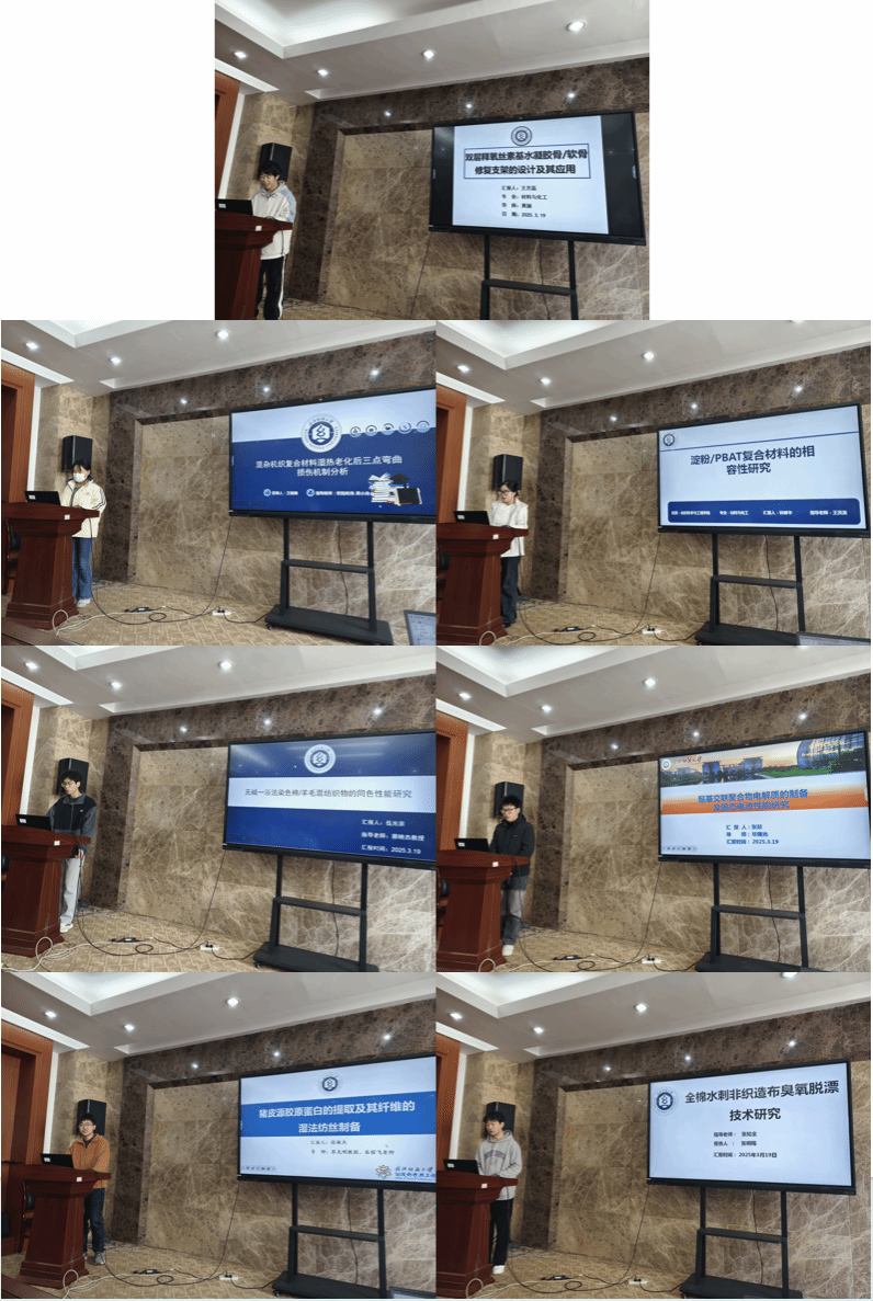 论坛上,王艺磊、王晓楠、林卿华、伍光宗、张燚、徐敏杰、张明赐七位同学依次介绍了自己的研究课题和目前取得的研究进展,并分享了自己的科研经验。主讲同学研究课题包括,双层释氧丝素基水凝胶骨/软骨修复支架的设计及其应用、混杂机织复合材料热老化后三点弯曲损伤机制分析、淀粉/PBAT复合材料的相容性研究、无碱—浴法染色棉/羊毛混纺织物的同色性能研究、醚基交联聚合物电解质的制备及固态电池性能研究、超声波辅助酶法提取精皮胶原蛋白的工艺优化及胶原纤维的湿法纺丝制备、全棉水刺非织造布臭氧脱漂技术研究。这些研究课题契合了“纺织新材料及绿色加工”主题,代表了成人短视频 最新研究进展,参会人员积极提出问题和建议,营造了良好的学术氛围。