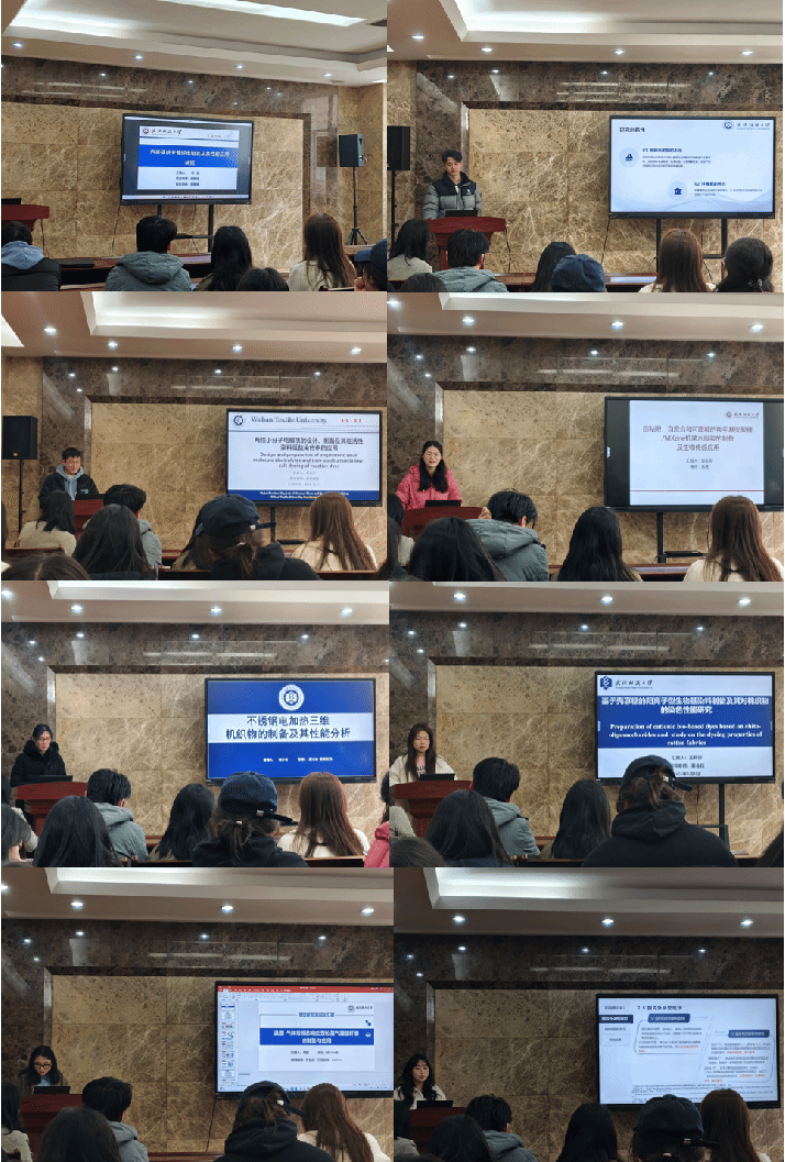 论坛上,董自豪、章凯、张必洋、邹毛毛、黄小可、王莉忻、周密、陈玥雪八位同学依次介绍了自己的研究课题和目前取得的研究进展,并分享了自己的科研经验。主讲同学研究课题包括,羧甲基纤维素和竹粉吸水树脂、内嵌碳纳米管纤维、两性小分子电解质、羧甲基壳聚糖/MXene抗菌水凝胶、不锈钢电加热三维机织物、阳离子型生物基染料、纳米芳纶基温度-气体双模态传感纤维、抗菌棉织物。这些研究课题契合了“纺织新材料及绿色加工”主题,代表了成人短视频
