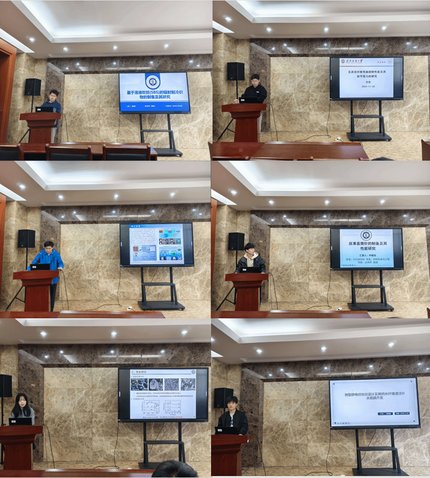 论坛上,潘朝青、李想、张天乐、仲璐瑶、顾宗雪、杨聪聪六位同学依次介绍了自己的研究课题和目前取得的研究进展,并分享了自己的科研经验。主讲同学的研究课题包括辐射制冷织物、玄武岩纤维、芳纶纳米原纤气凝胶纤维、丝素基微针、全生物质压力传感器、微型静电纺丝仪。契合了“纺织新材料及绿色加工”主题,代表了成人短视频 最新研究进展,参会人员积极提出问题和建议,营造了良好的学术氛围。