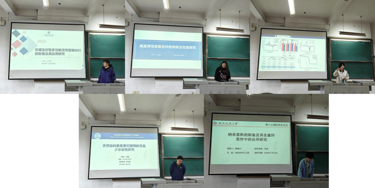 论坛上,张文雅、汪彬涵、李巍巍、刘磊、陈颖川五位同学依次介绍了自己的研究课题和目前取得的研究进展,并分享了自己的科研经验。主讲同学的研究课题包括环境友好型多功能活性包装材料、液晶弹性体复合纱、溶液喷射纺蒲草基相变PAN纤维、天然染料姜黄素、纳米浆料,契合了“纺织新材料及绿色加工”主题,代表了成人短视频