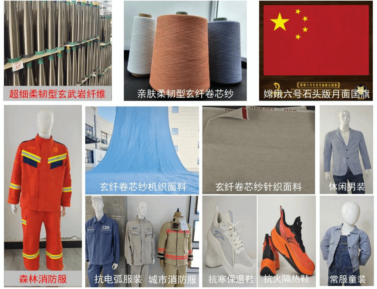 目前,该系列产品已与湖北汇尔杰新材料科技有限公司、际华三五四二纺织有限公司、武汉裕大华纺织有限公司、安踏集团、航宇救生装备有限公司等多家企业开展合作开发与生产应用,为航天服、月面帐篷、飞船内饰、航空飞行器座椅套等提供核心材料支撑。经过全国技术严格筛选,本项目技术产品入选和受邀在央视节目《中华考工记》中展示(近期将在央视一套播出,以实际节目播出安排为准)。2025年6月25日,中国纺织工业联合会组织成立了权威专家组,到玄武岩纤维先进纺纱加工技术生产现场鉴定,一致认为达到卷芯纺纱技术达到了国际领先水平。本项目汇聚了武汉纺织立大学、汇尔杰新材料科技股份有限公司、武汉裕大华纺织有限公司、际华三五四二纺织有限公司、江阴海澜科技有限公司、安踏(中国)有限公司、鲁泰纺织股份有限公司、云南凤滢实业有限公司、溢达纺织有限公司等企业,通过“矿石原料-纤维纺丝-纺纱织造-印染整理-服装品牌-航空航天等全产业链”的校企交叉融合式创新,构建了完善的生产与质量保障体系,创建并运营了玄武岩超细柔韧化纤维、卷芯复构纱线和面料制品(见图3)产业化生产线,工艺技术成熟,设备运行稳定,实现了低损、低扭、全包覆的玄武岩纤维卷芯复构纱及其制品的工业化生产,从军工航天到民用防护,显著提升了国产高端防护纺织品市场竞争力和产业链自主可控能力。2025年9月项目技术荣获2025年度中国纺织工业联合会科技进步壹等奖。