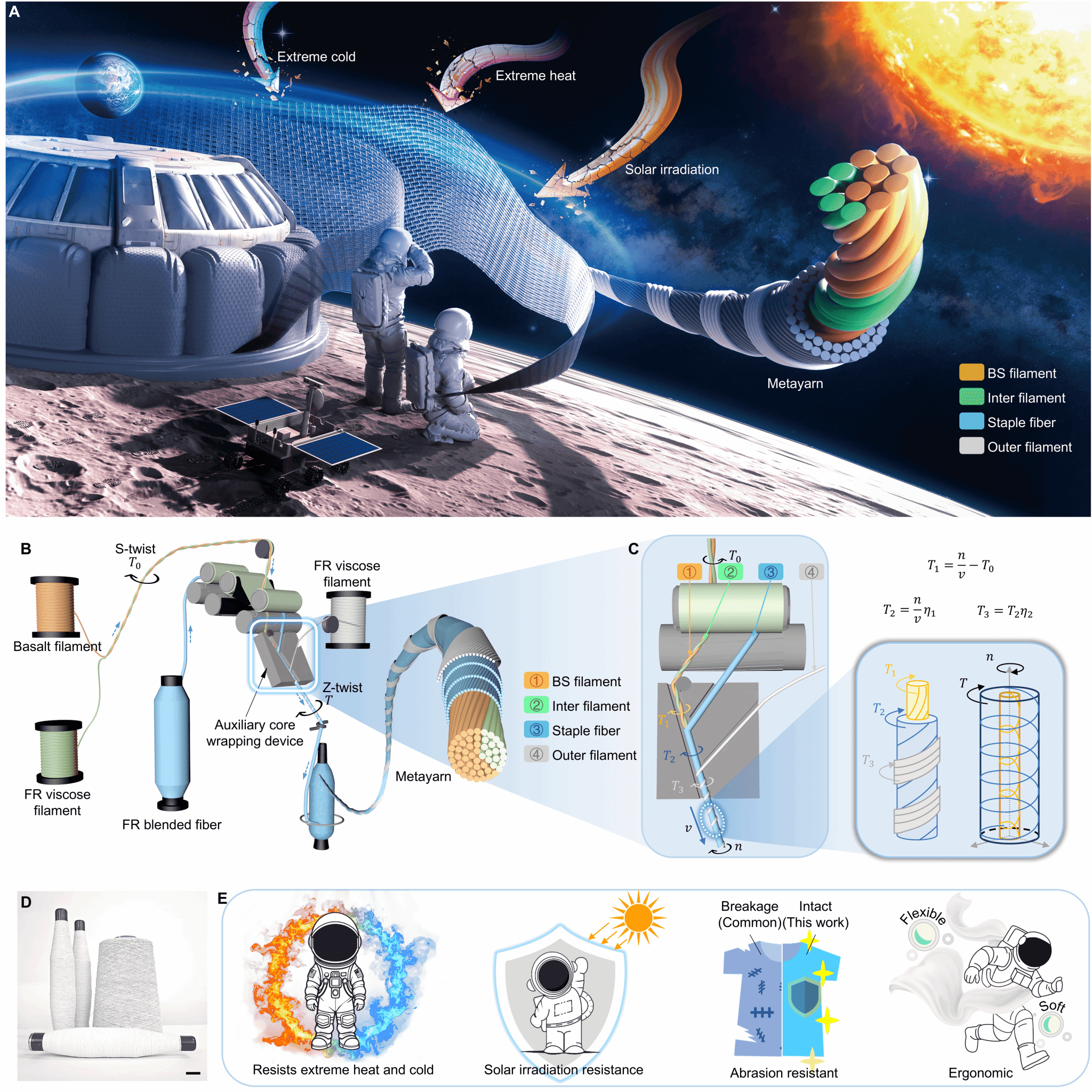 徐卫林、夏治刚、陶光明教授带领尚路路、徐傲、张世亮等研究生,针对当前技术持续改进创新,首创“coaxial spiral wrap spinning”技术,突破了无损低扭成纱、多层级稳态包覆等关键技术与装备创新,工业化实现了多层级、有机无机复构的亲肤柔韧型玄武岩超结构纱线(Metayarn)批量化连续生产。所生产的Metayarn纱强度较原玄武岩长丝提升27.76%,成纱残余扭矩较其他商用纱线大幅降低,可直接针织或机织加工生产出亲肤柔性Metayarn制品。面向航空航天复杂极端环境,Metayarn制品展现出卓越的环境适应性与结构稳定性。柔韧性制品在−200℃液氮、300℃热风持续冲刷以及强太阳辐照长时间照射等条件下,其强度不仅未发生衰减,反而有所提升;在1300℃火焰灼烧后仍能保持结构完整。同时,MetaYarn针织制品具备高达421%的断裂伸长率,在30%拉伸状态下仍能保持优异的阻燃与抗火性能,实现了“舒适-防护”一体化功能。