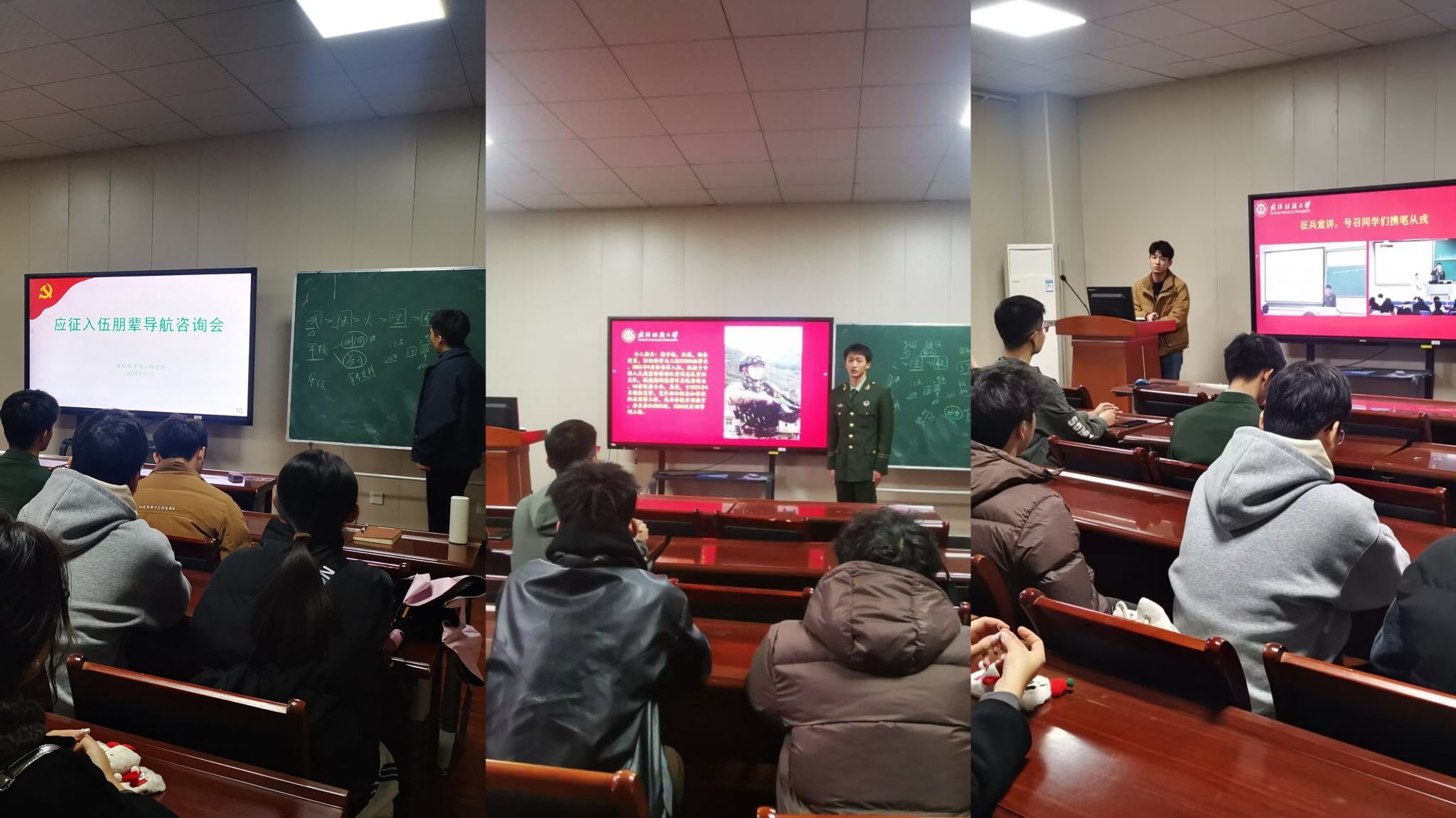 近期开展了征兵宣讲、征兵入伍朋辈导航咨询交流会、退役大学生座谈会等活动。学生工作负责人赵亮、征兵联络员梁祥云、各年级辅导员及全部本科生和部分研究生参加了相关活动。