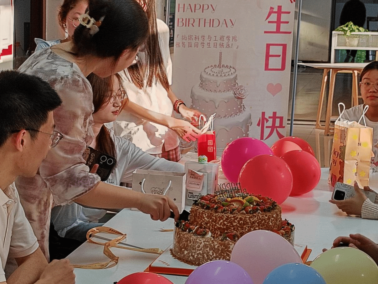 礼物交完成后,同学们一同合影留念,将今天的美好记忆存档。合影完成后,主持人再次向参加活动的五月份寿星们表示祝贺,愿大家在新的一岁里,学业有成,前程似锦。最后,伴随着生日歌和同学们的欢声笑语,大家齐唱生日歌,共同分享生日蛋糕。