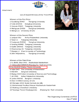 、西安工程大学、浙江理工大学和天津工业大学共53名研究生作了学术汇报。参与汇报的研究生主要为博士生,我院二年级硕士研究生黄傲同学参与了本次会议,她的学术报告引起了与会人员的很大兴趣,并荣获得三等奖好成绩,展现了我院研究生的良好风采,这是我院研究生首次获此奖项。