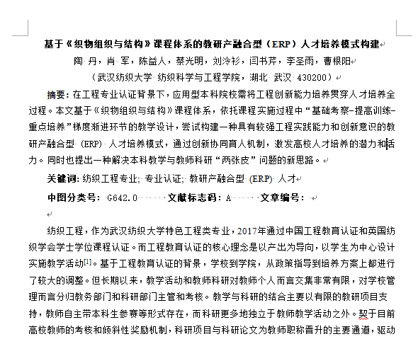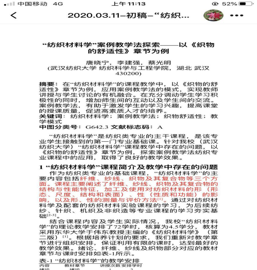 部分青年教师宅在家里,缺少工作氛围。“湖北名师工作室”主持人李建强教授鼓励大家利用在家的时间写一篇教研论文,并非常耐心地讲解教研论文对学科发展以及教学工作的重要意义。在李老师的指导下,青年教师饶崛老师撰写教研论文并被《纺织服装教育》收录,新进博士唐晓宁老师的教研论文也已完稿待投。回忆论文的写作过程,唐老师讲到:“起初,觉得自己教学经验很少,不敢动笔去写,李老师鼓励我思考总结《纺织材料学》课程的助教情况以及他在教学模式上的创新尝试,并让我向蔡光明副院长请教教研论文的写作手法。论文撰写的过程中,李老师针对学生培养、专业认证、思政教育以及学科内涵等内容提出宝贵意见,作为主管教学的副院长与纺材课程的任课教师,蔡老师则是从教学日常管理以及培养目标达成等角度,对论文提出修改建议”。通过教研论文的撰写,青年教师对专业知识体系及教学设计均有了更深刻的认识。