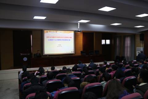 全体教职工及部分学生骨干代表在行政楼二楼学术报告厅,听校党委常委、副校长罗锦银关于党的十九大的辅导报告, 罗锦银为大家作了题为“高举习近平新时代中国特色社会主义思想伟大旗帜--让党的十九大精神在学校落地生根”的辅导报告。