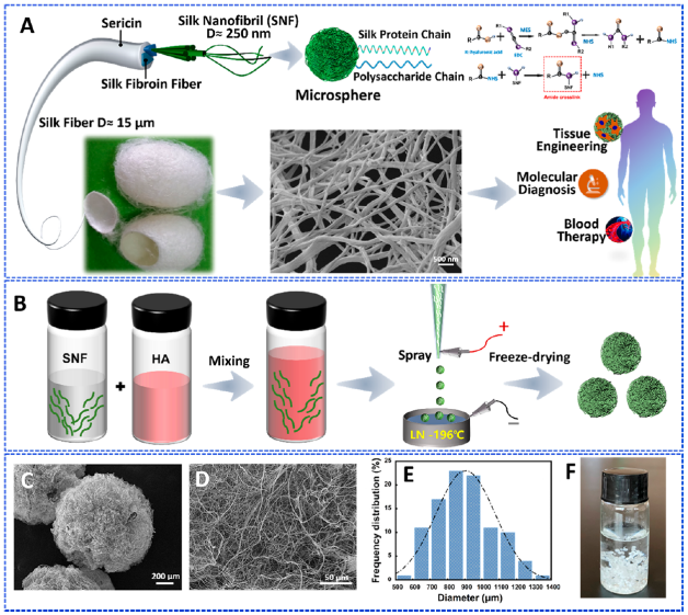 蛋白质纳米纤维具有良好的生物相容性、高的比表面积和缓慢的降解性等优异性能,在生物医学领域具有广阔的应用前景。蚕丝纳米原纤是一种天然、丰富的蛋白质纳米纤维,在生物材料领域极具潜力。本文通过在水溶液中机械剥离的方法制备了蚕丝纳米纤维。纤维制备的过程完全基于水溶液体系,能够保持其优异的生物相容性。受细胞外基质(ECM)独特的纳米结构和生物活性成分的启发,细胞外基质多糖透明质酸被用于调控微球的成型、调节丝纳米纤维的组装,以及控制微球的结构和性质。在透明质酸的调控下,蚕丝纳米纤维能够通过静电喷射组装成尺寸为数百微米的微球。制备的微球具有3D蓬松的纳米纤维网络结构和优异的吸水性能,能够支持骨髓间充质干细胞的长期增殖,并能够显著促进干细胞的成骨分化,证实了其作为细胞载体和组织工程微支架的巨大潜力。此外,蚕丝纳米纤维微球被进一步功能化用于胰蛋白酶检测和血液净化(胆红素的清除),展示了在不同生物医学应用中的潜能。