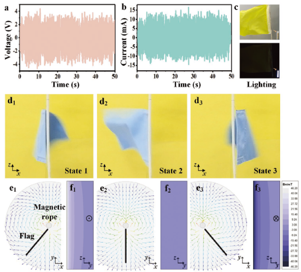 图2. 柔性磁电风力发电旗帜的发电原理和便携性
