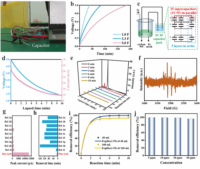 图5. 柔性磁电风力发电旗帜用于电化学氧化有机色素的测试