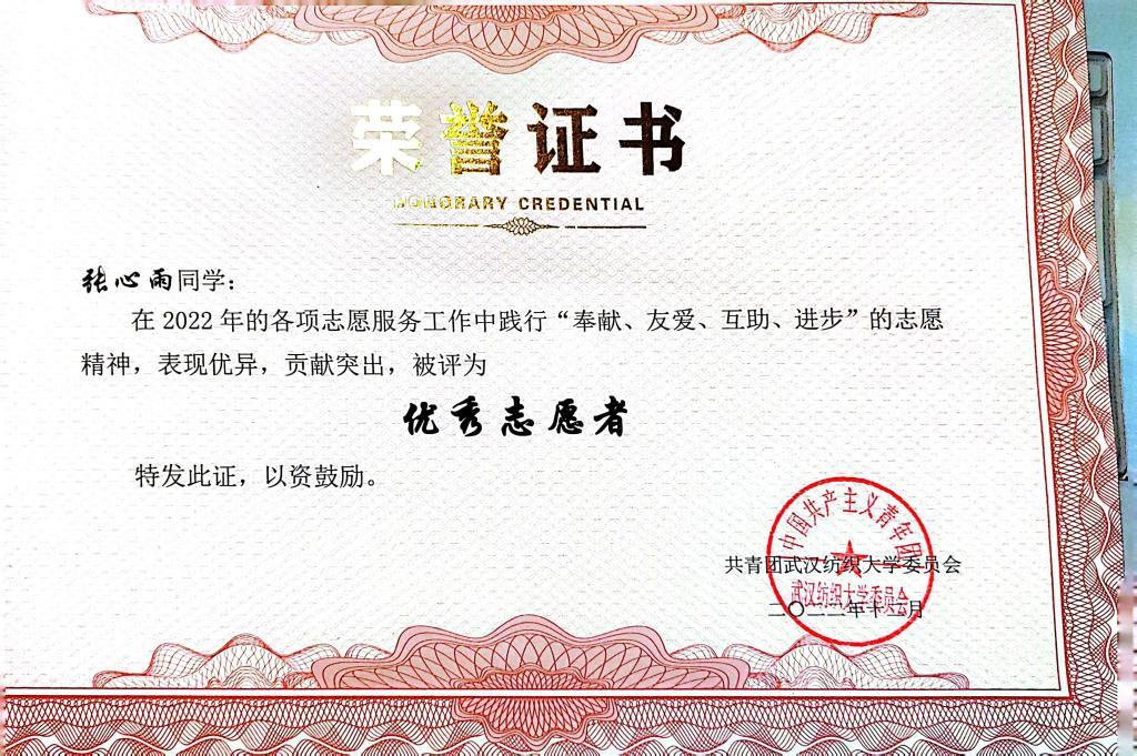 青春力量感动纺大大学生榜样人物”、“校阳光好青年”、“校青年志愿者优秀个人奖”、“校三好学生”、“校优秀团干”、“校优秀志愿者”、“五四积极分子”等荣誉称号,获得全国大学生英语作文大赛国家级二等奖、大学生创新创业国家级立项、发表有关纺织品吸声降噪课题研究论文、国家励志奖学金、森马校企奖学金等荣誉。