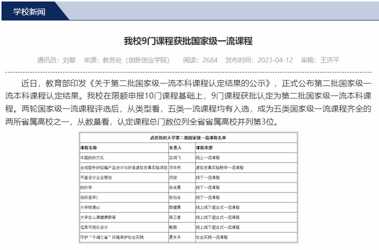 1.纺织科学与工程学科入选2023“软科世界一流学科排名”前三,学科建设再攀高峰。今年10月,高等教育评价专业机构软科正式发布2023“软科世界一流学科排名”,成人短视频