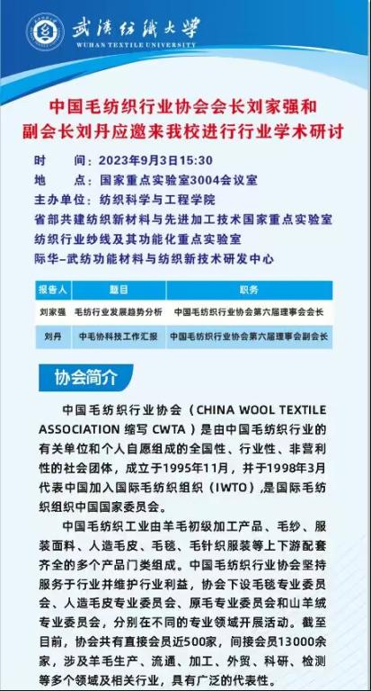 9月3日,中国毛纺织行业协会会长刘家强、副会长刘丹到成人短视频访问交流,参观学校纺织科技馆,中国毛纺织行业协会会长刘家强、副会长刘丹分别就毛纺行业发展趋势分析、中国毛纺织行业协会科技工作汇报进行了交流报告。