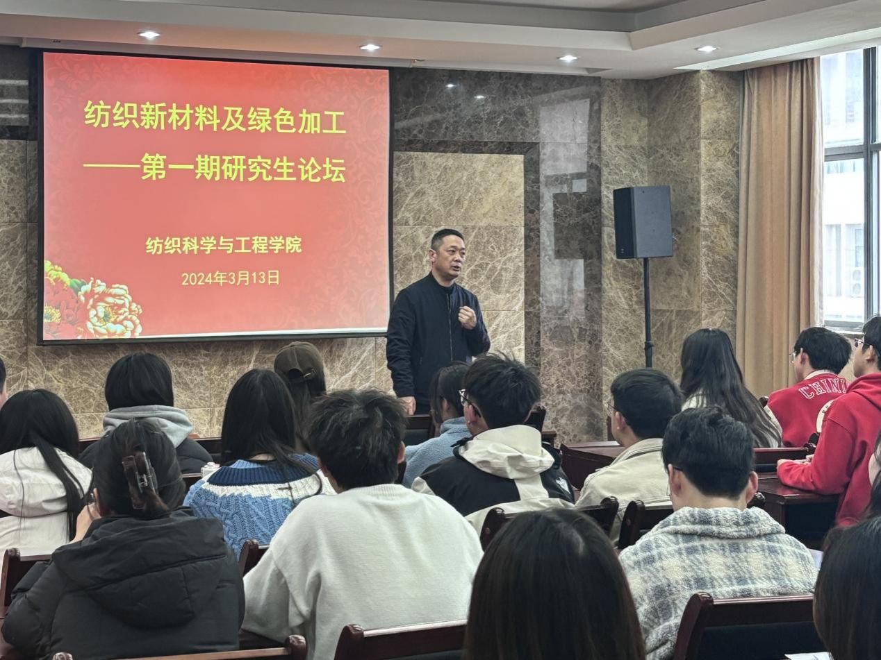 首先,姜院长介绍了举办研究生论坛的主旨和意义,以及今年研究生论坛开展安排。同时宣布第一期“纺织新材料及绿色加工”研究生论坛开始。