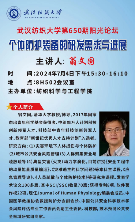 清华大学翁文国教授应邀于2024年7月4日下午做客我院,为我院师生作线下学术报告,学术报告题目为:“个体防护装备的研发需求与进展”。学术报告由院长蔡光明教授主持,蔡光明教授和成人短视频