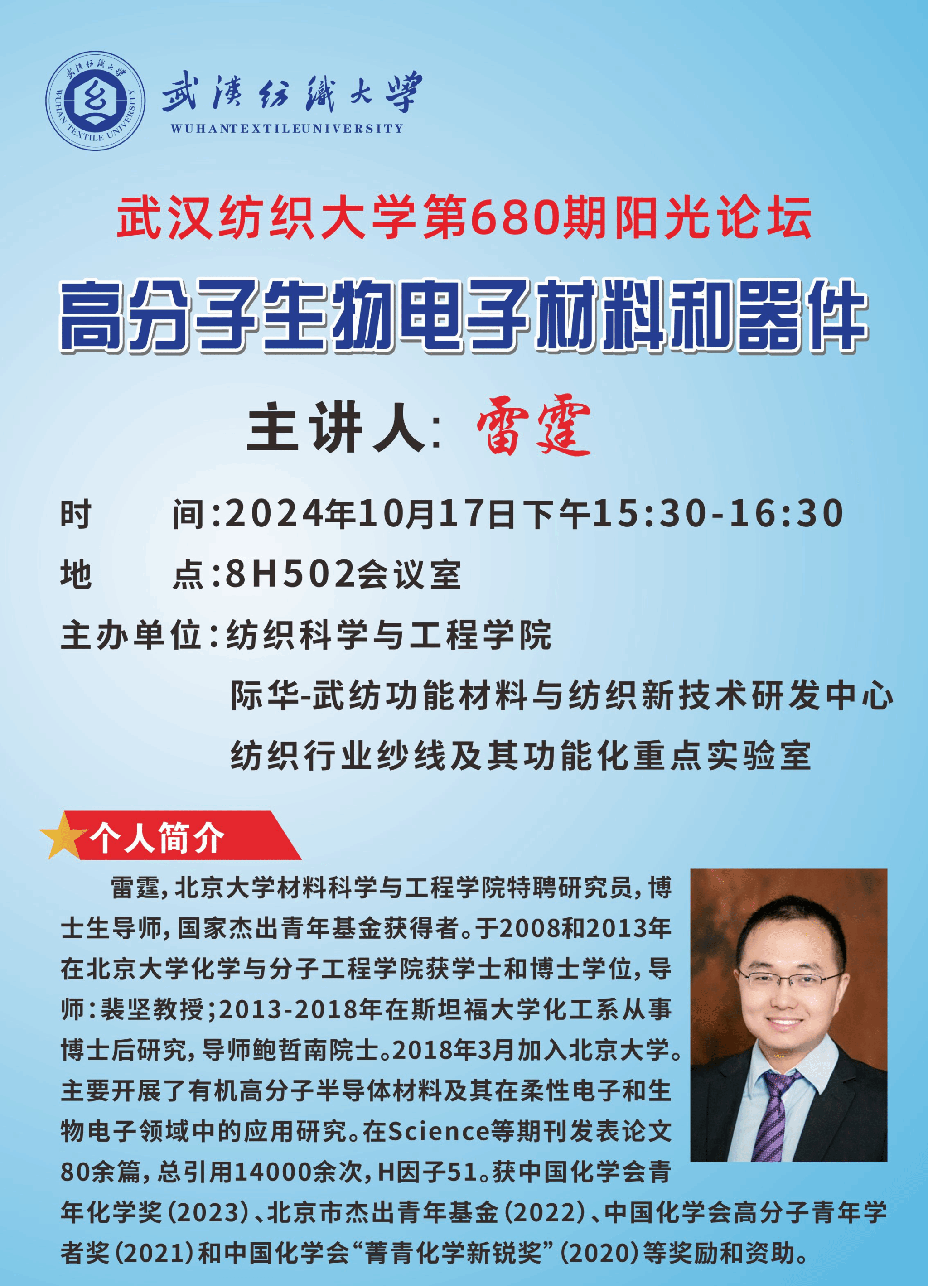 特聘研究员、国家杰出青年基金获得者雷霆应邀于2024年10月17日下午做客我院,为我院师生作线下学术报告,学术报告题目为:“高分子生物电子材料和器件”。学术报告由副院长夏治刚教授主持,夏治刚教授和成人短视频