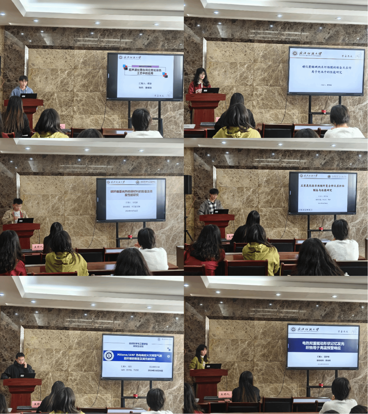 论坛上,杨余、廖明敏、华克润、陈千福、徐杰和雷梦蝶六位同学依次介绍了自己的研究课题和目前取得的研究进展,并分享了自己的科研经验。主讲同学的研究课题包括超声波处理、纳米纤维膜、碳纤维基光热转换材料、长丝短纤复合纱、气凝胶纤维、电热双重驱动形状记忆发光织物,契合了“纺织新材料及绿色加工”主题,代表了成人短视频