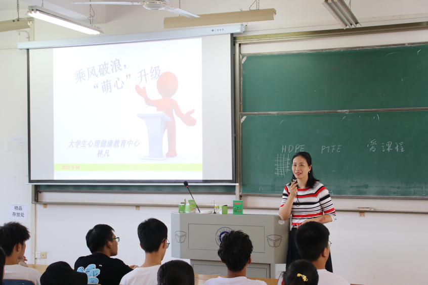 于9月30日下午2点,在3栋教学楼举行了一场以“乘风破浪,萌心升级”为题的心理健康教育讲座,本次讲座由学校心理健康教育中心专职教师林凡主讲,2020级全体新生参加。
