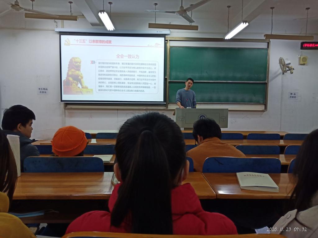 在3H315召开十九届五中全会精神学习本次会议由李亮老师主讲,各年级学生干部参加会议。