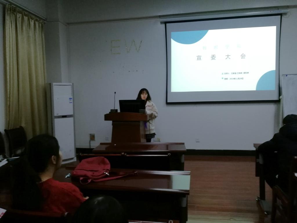 宣传部于11月29日傍晚在8栋502会议室召开了宣委大会。17~19级宣传委员以及宣传部全体人员参加了此次会议,本次大会由宣传部部长王家鑫、卫浩浩、蒙珍婷三人主讲。