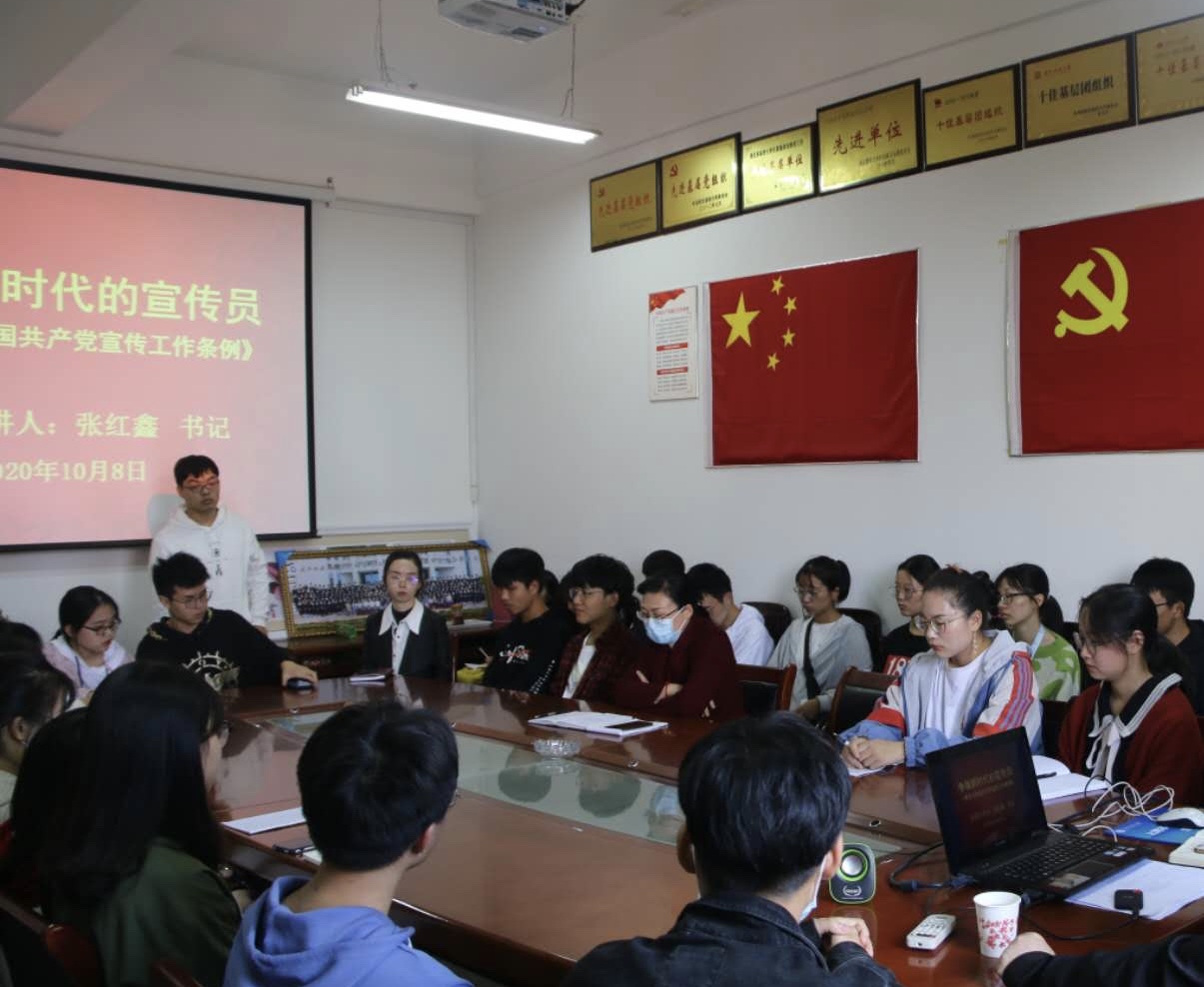 ,由浅入深强地向同学们讲解了宣传工作的意义与价值。随后张红鑫向同学们重点讲解《中国共产党宣传工作条例》。张红鑫强调作为一名宣传工作者,应注重自身思维、能力、格局的锻炼,以传播正能量为主,积极的找身边亮点,以此打造纺院特色宣传窗口。最后,张红鑫提出了四点建议:注重新闻稿的及时性,官网官微两不误;锻炼敏锐性,主动挖掘素材,以正确的政治站位推进宣传价值发展;围绕纺院教育办学理念,从班风到院风体现“崇真善美”的师生整体风貌;主动谋划宣传工作,积极交流,杜绝工作碎片化,齐心协力将纺院宣传工作向外向上拓展。