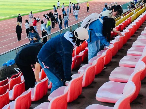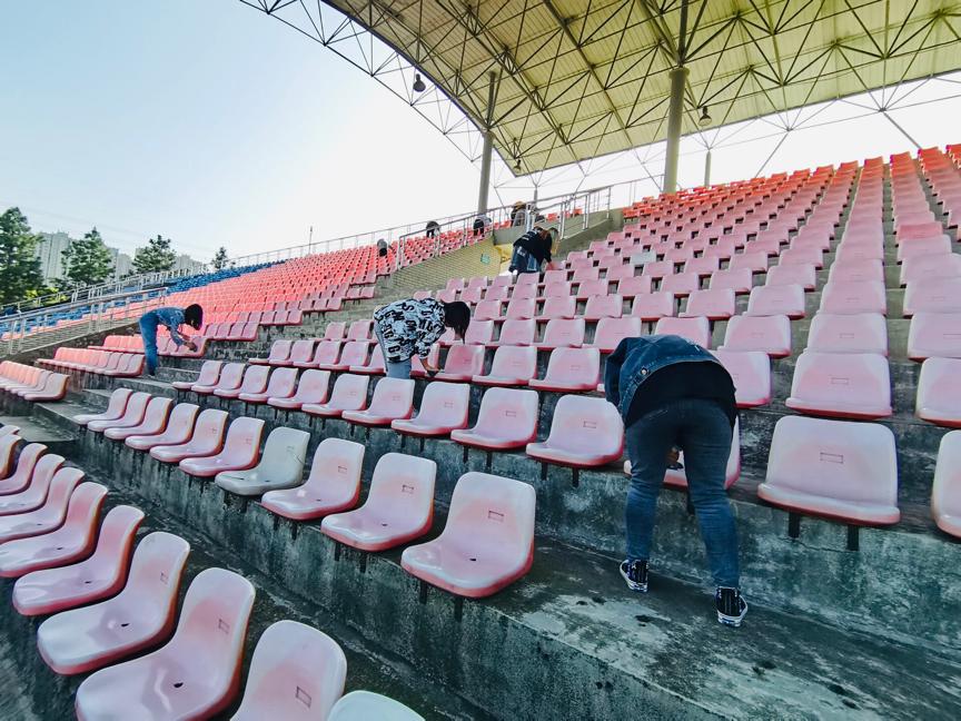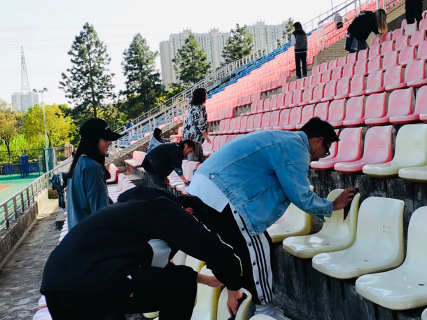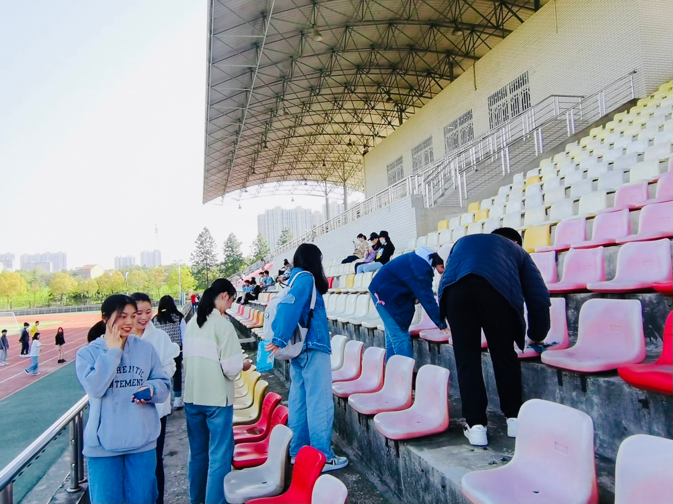 学生阳光向上,精神饱满的良好状态。活动开始同学们对看台下的座椅进行了清扫,随后一直往后排座椅进行擦拭。由于座椅上有很多灰尘还有鸟的排泄物,于是同学们在看台上进行了集中的清扫活动,对灰尘进行了处理,取得了较好的效果。