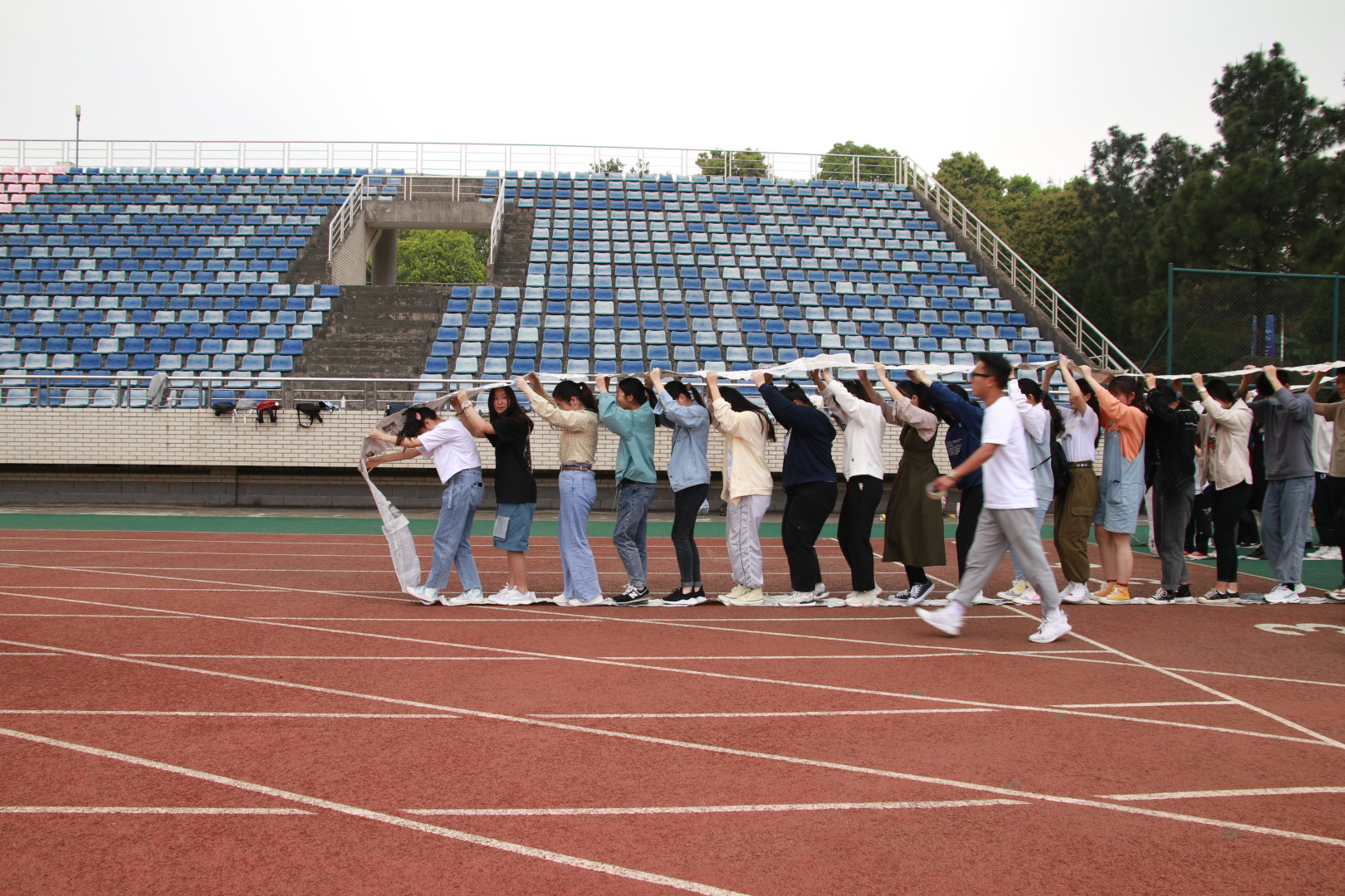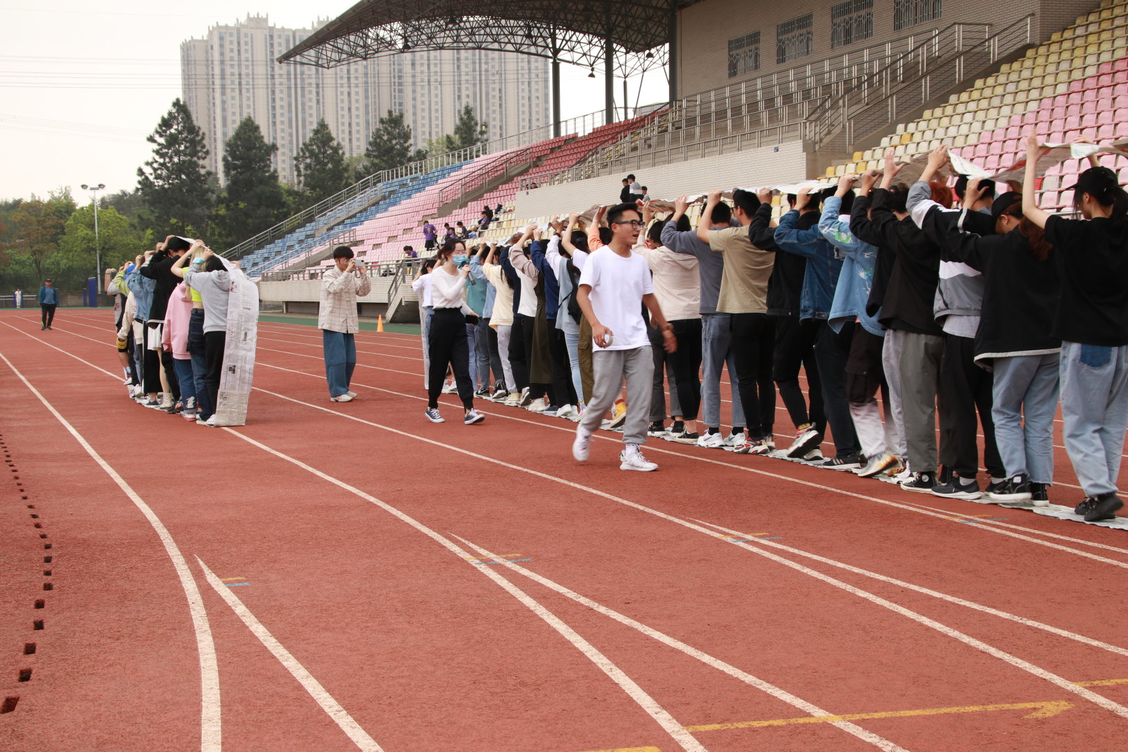 当日,阳光明媚,在年级辅导员的组织和带领下,全体20级学生和部分高年级同学在操场集合,随即开始了游戏环节。游戏名为“无敌风火轮”,重在培养班级同学的团队协作能力。游戏开始,纺院各班长就充分发挥出其领导能力——分发道具、安排分工……各项准备有条不紊地进行。最后,在所有同学的努力下,象征着各班集体的“风火轮’在跑道上稳稳前进,先后安全抵达终点。
