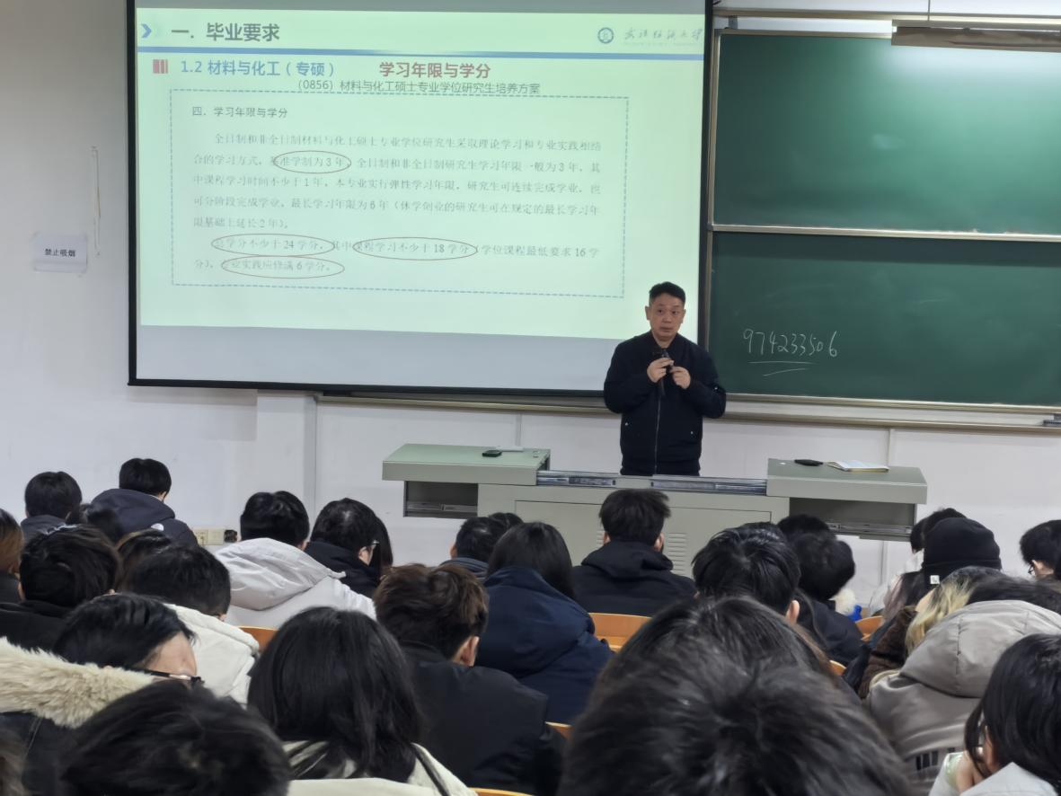 会议伊始,姜会钰围绕研究生培养的核心环节展开详细讲解。在毕业要求方面,他系统梳理了学分修读、学术成果、学位论文等关键指标,并结合往年案例提醒同学们务必提前规划、对标对表,避免因细节疏漏影响毕业进程。他鼓励大家合理平衡课程学习与科研任务,主动与导师沟通,稳步推进课题研究。