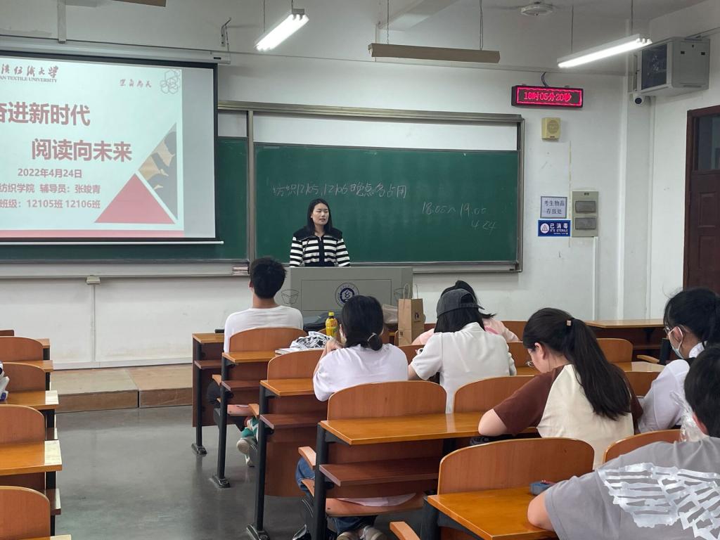 在21级现场,辅导员张竣青老师分别从4月23日是读书日引入,提出希望同学们利用好学校图书馆的资源,同时纺织12105班和纺织12106班的学习委员王天骄和冯林分享了《洛丽塔》和《人生》两本书籍以及读书心得,在这基础上张竣青老师总结道,在日常生活中要从不同的角度去看待事情,未来的生活都是未知的,我们都要以积极乐观的心态去面对,要珍惜当下的生活。并提醒同学们在面对各种网络信息时,要理性思考,判断信息真伪,做到不造谣,不传谣。不轻信“标题党”、不轻易“跟风”、不进莫名其妙的聊天群、不传播来源不明的文章。并且进一步强调了现阶段疫情局势的严峻,要求同学们要遵守成人短视频