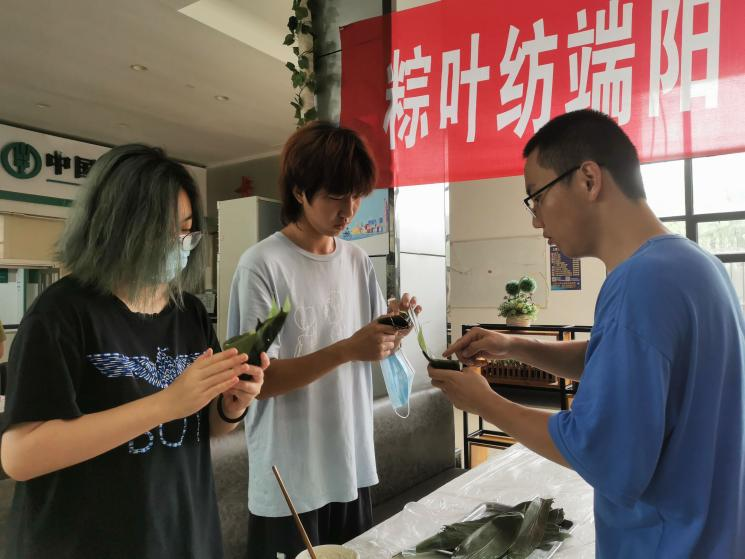 (院团委张竣青老师和同学们一起动手包粽子)