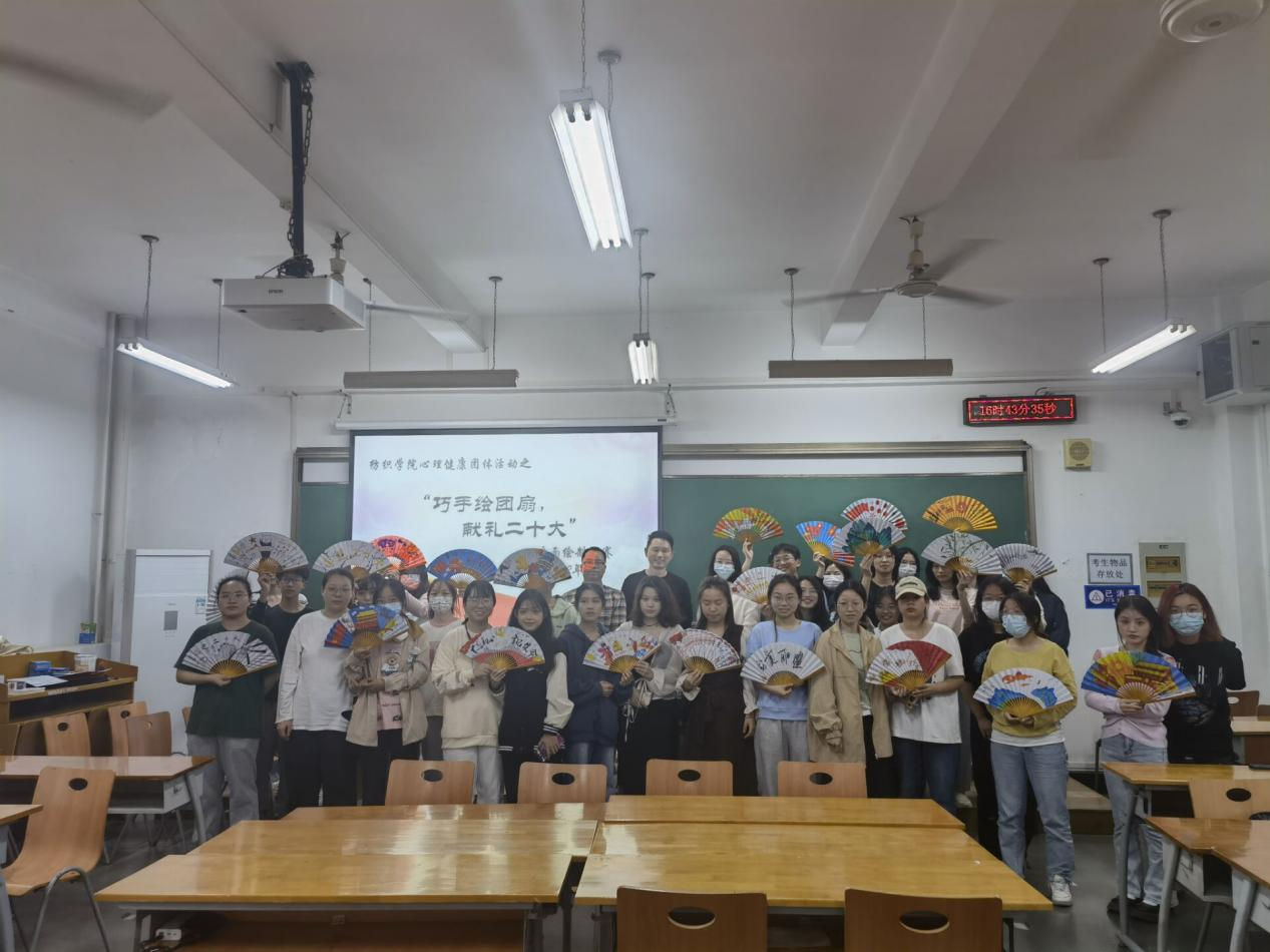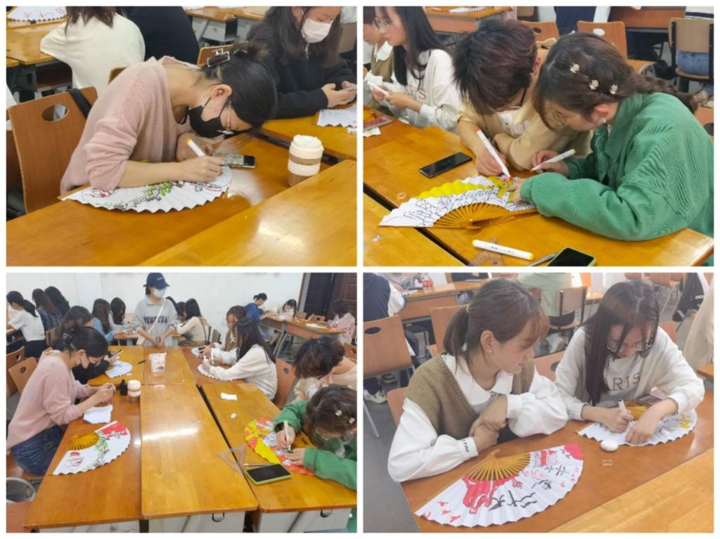 给同学们分发空白扇子以及绘图工具,同学们拿到工具后,教室里充满了激烈的讨论声,大家共同讨论扇面的布局以及配色。在讨论后,同学们兴趣盎然,纷纷拿起毛笔,在折扇上挥毫泼墨,仔细描摹,起笔,落笔,或浓墨重彩,或轻描淡写,一笔一画间包含同学们对中国传统文化的热爱,对党的深情祝福。经过同学们用心绘制下,一幅幅充满诗意雅趣、唯美精致、古色古香的扇面就制作完成了。随后老师们也共同讨论学生作品,同学们热情地展示自己的作品并交流自己制作时的心得与体会。活动最后,老师们与同学们共同合影留念,记录这精彩的活动。