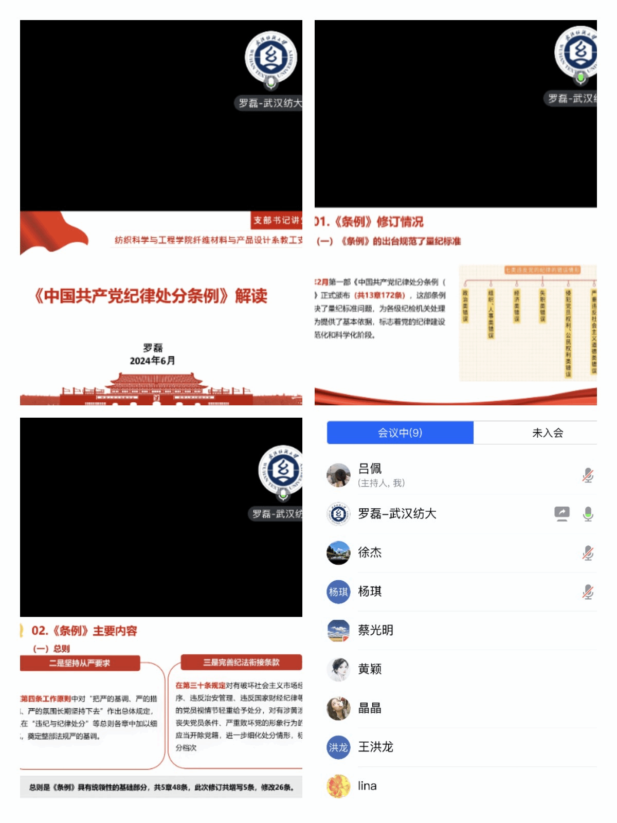 学生第一党支部、第二党支部、第三党支部集中学习了新修订的《中国共产党纪律处分条例》,强调了党员应具备的政治品格和使命担当。学生第一党支部向婷通过讲述身边优秀党员的模范事迹,激励学生党员们深入学习,严格要求自己;学生第二党支部书记王然强调了学纪、知纪、明纪、守纪的重要性;学生第三党支部书记张竣青通过身边师生党员的生动故事,激发了党员们学习先进、争当先进的热情。非织学生党支部书记吴童玲以“坚定理想信念,永葆党员本色”为核心,引导党员们自觉学法明纪,严格自我约束。通过重温党的六大纪律,党员们表示将自觉改进作风,树立新风。轻化工程专业学生党支部书记余国铖强调各位党员要从强化政治修养、自觉学法明纪、坚持立身为旗、学习模范事迹等四个方面增强纪律意识。研究生第一、第二党支部书记唐晓宁、梁祥云强调了纪律的重要性,指出纪律是管党治党的“戒尺”,也是党员、干部约束自身行为的标准和遵循。会议要求党员们学纪、知纪、明纪、守纪,将遵规守纪内化为言行准则,增强政治定力和纪律定力。