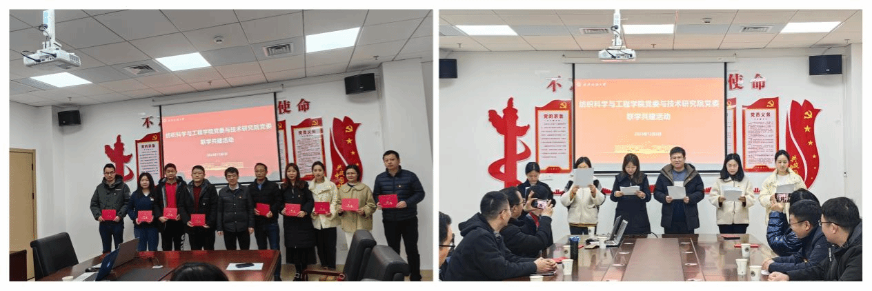 党委书记朱张军、技术研究院党委书记涂耀威共同签订《党建联学共建协议书》,为两院构建资源共享、优势互补、提升互促的党建工作新格局筑牢根基。朱张军指出,两院一直以来就是“同气连枝”的共同体,共同在“纺织”大学科的枝丫上汲取养分,也立足岗位贡献力量。希望未来双方能在打通壁垒中打造新引擎,在互学互鉴中激发新活力,在联合学习中探寻新发展。随后,在全体党员的见证下,会上,双方党组织负责人为12月入党的党员代表赠送“政治生日”贺卡,党员代表进行红色诗歌朗诵展示,引导党员时刻不忘自己的“第一身份”,发挥先锋模范作用。最后,涂耀威在总结讲话中表示,“联学共建”不仅在纸面上,更在实际工作点滴之中,本次活动是技术研究院党委与成人短视频