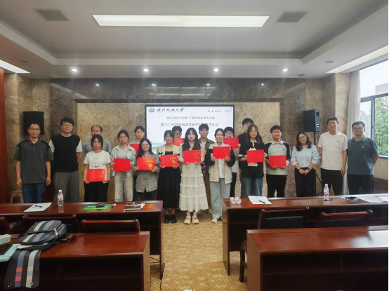 黄嘉琪同学介绍了项目智慧城市纱线基智能水泥复合材料;环境科学12201班刘芷怡介绍了项目铁基调理剂耦合微生物协同修复镉铬污染土壤的界面调控机制;应用化学12301班覃妹彤同学介绍了项目亚稳态催化剂突破尿素氧化能垒瓶颈赋能绿色转化;化妆品12202班陶冰珊同学介绍了项目智能突释一酸响应绿原酸双层微球的制备及应用;高分子12301班王润之同学介绍了项目"纤纸绝缘"﹣聚苯硫醚超细纤维复合芳纶绝缘纸;环工12302班吴家辉同学介绍了项目磁碳先锋:磁性多孔碳吸附﹣氧化﹣资源化三位一体驱动抗生素废水高效净化技术;化工12301班余梦云同学介绍了项目氢键调控多糖长余辉磷光用于湿度传感的研究;生物工程12301班张杰灵同学介绍了项目人雄激素源性脱发治疗;生物工程12302班张向楠介绍了项目生物质基席夫碱增强环氧树脂抑烟性能和机械性能;高分子12201班周成同学介绍了项目"雾遁卫士"-国内生物质类流体防雾剂开拓者;轻化12201班同学周燕霞介绍了项目如虎添翼﹣光热双隐身织物的设计与开发。各位同学汇报结束后,评委老师就项目内容与汇报的同学进行了交流,对各个项目进行了细致的点评指导。交流结束后,评委老师为参与汇报的同学颁发证书并合影留念。