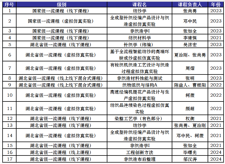近日,湖北省教育厅公布2024年省级一流本科课程认定结果,成人短视频 申报的《工程创新方法》、《非织造布后整理》两门课程成功获批立项。至此,成人短视频 省级一流本科课程总数增至13门。